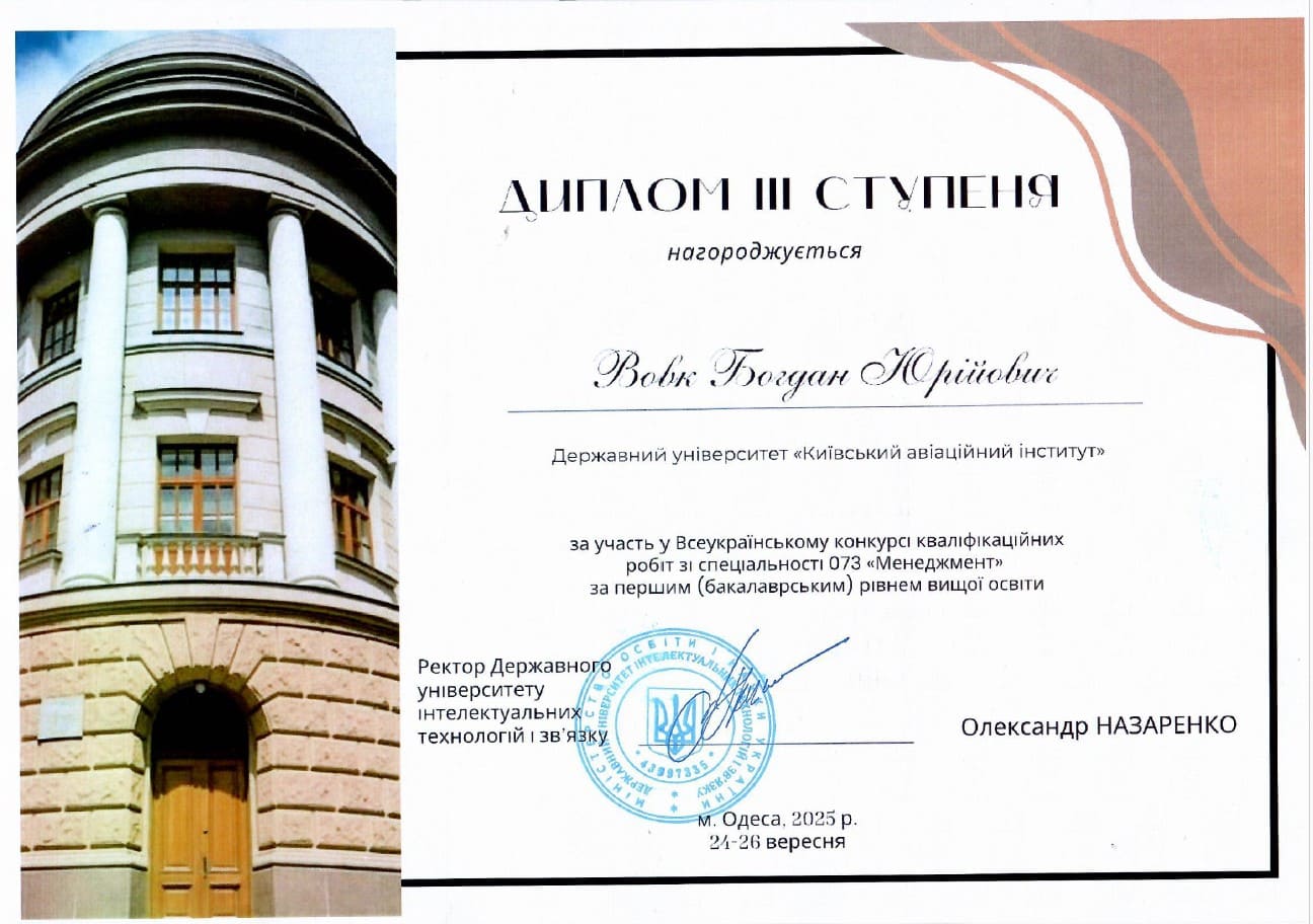 3 місце: ВОВК Богдан Юрійович, освітній ступінь – бакалавр, спеціальність 073 «Менеджмент», ОПП «Логістика»;