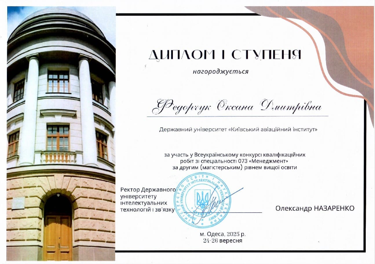 1 місце: ФЕДОРЧУК Оксана Дмитрівна, освітній ступінь магістр, спеціальність 073 «Менеджмент», ОПП «Глобальна логістика та управління ланцюгами постачання»;