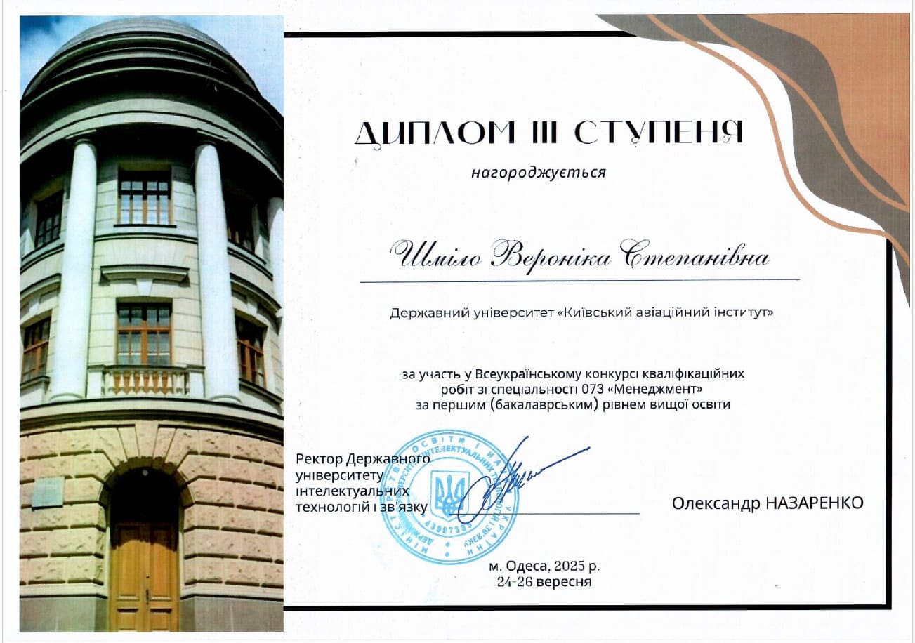 3 місце: ШМІЛО Вероніка Степанівна, освітній ступінь- бакалавр, спеціальність 073 «Менеджмент», ОПП «Логістика»;