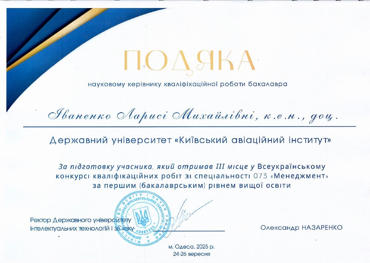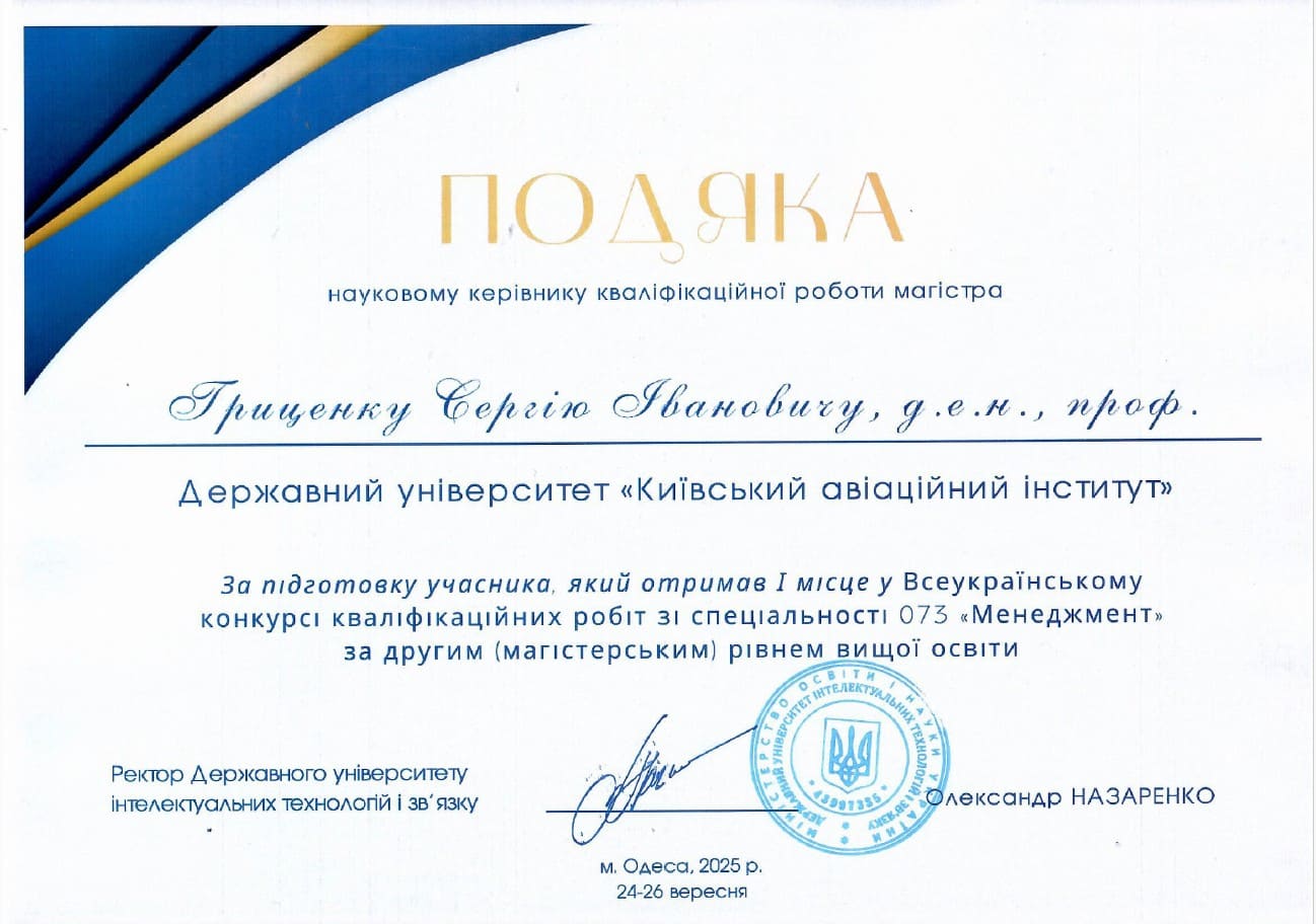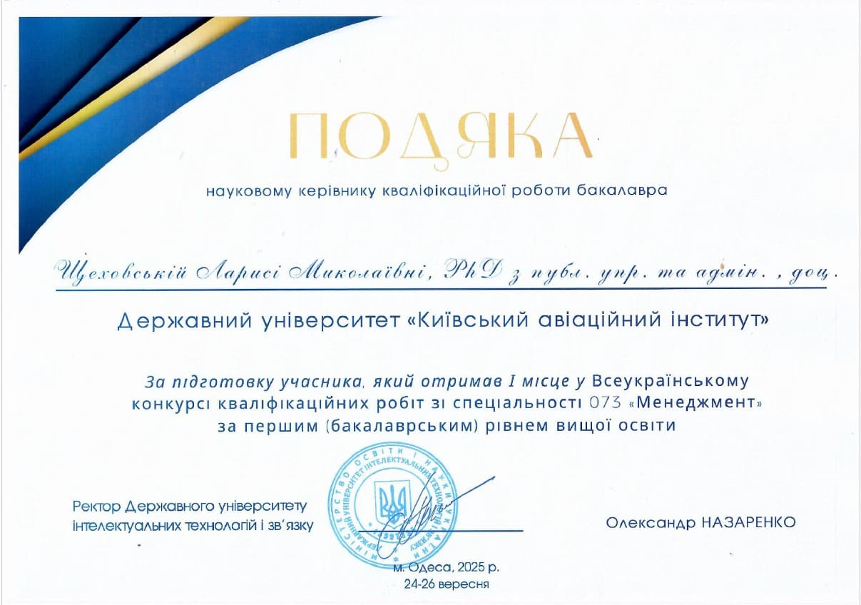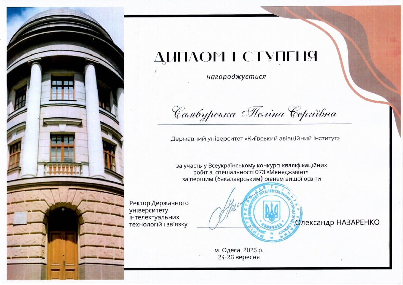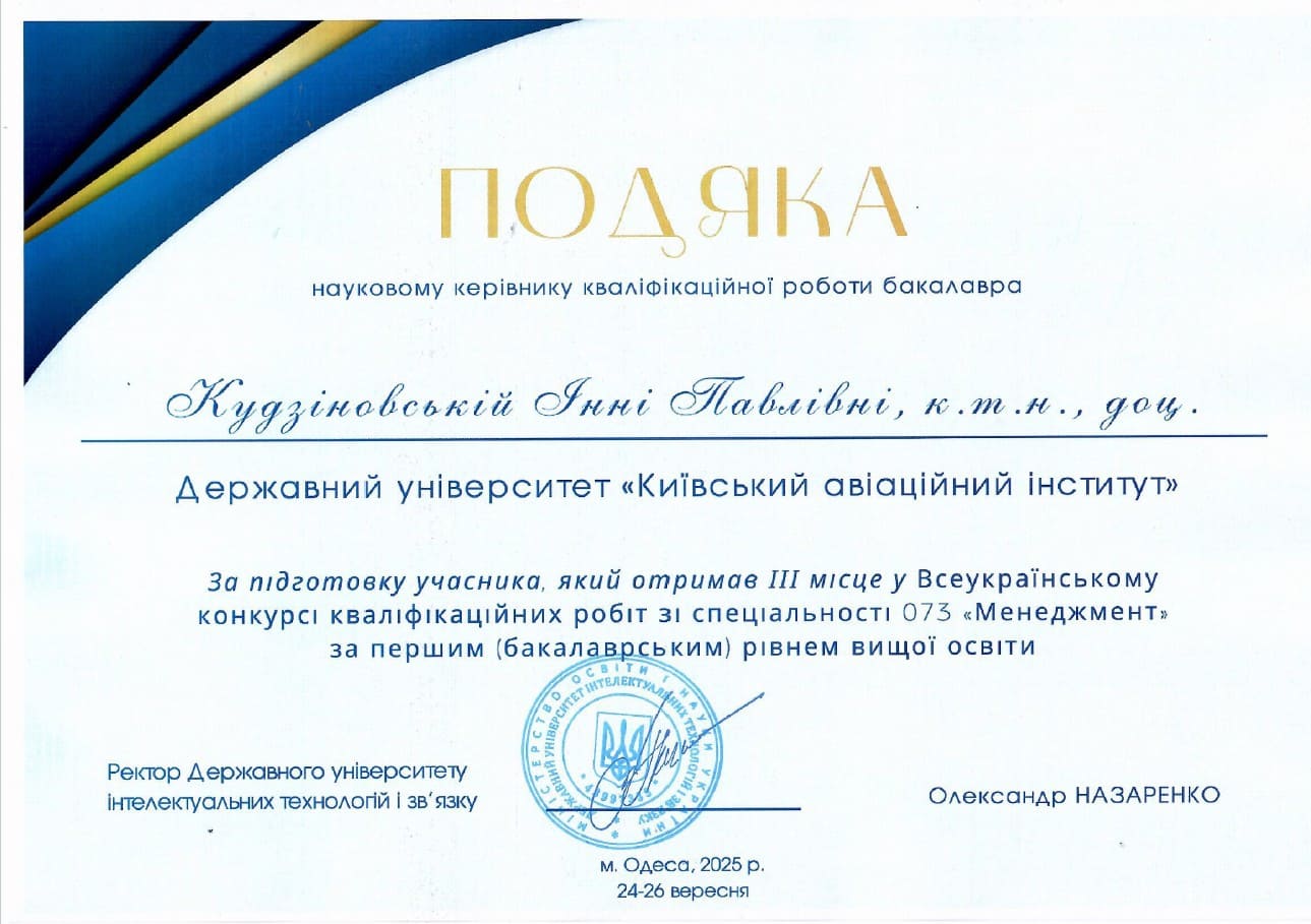 З великою радістю повідомляємо результати Всеукраїнського конкурсу кваліфікаційних робіт зі спеціальності 073 «Менеджмент» за першим (бакалаврським) і другим (магістерським) рівнем вищої освіти, який проходив у Державному університеті інтелектуальних технологій і зв’язку (м. Одеса)!